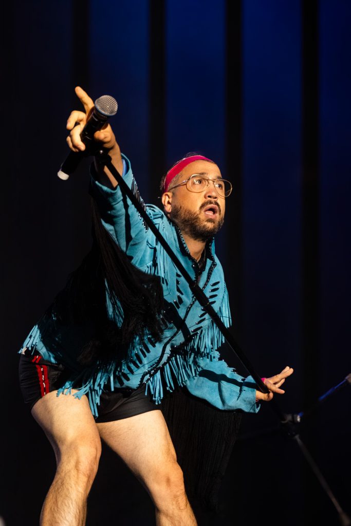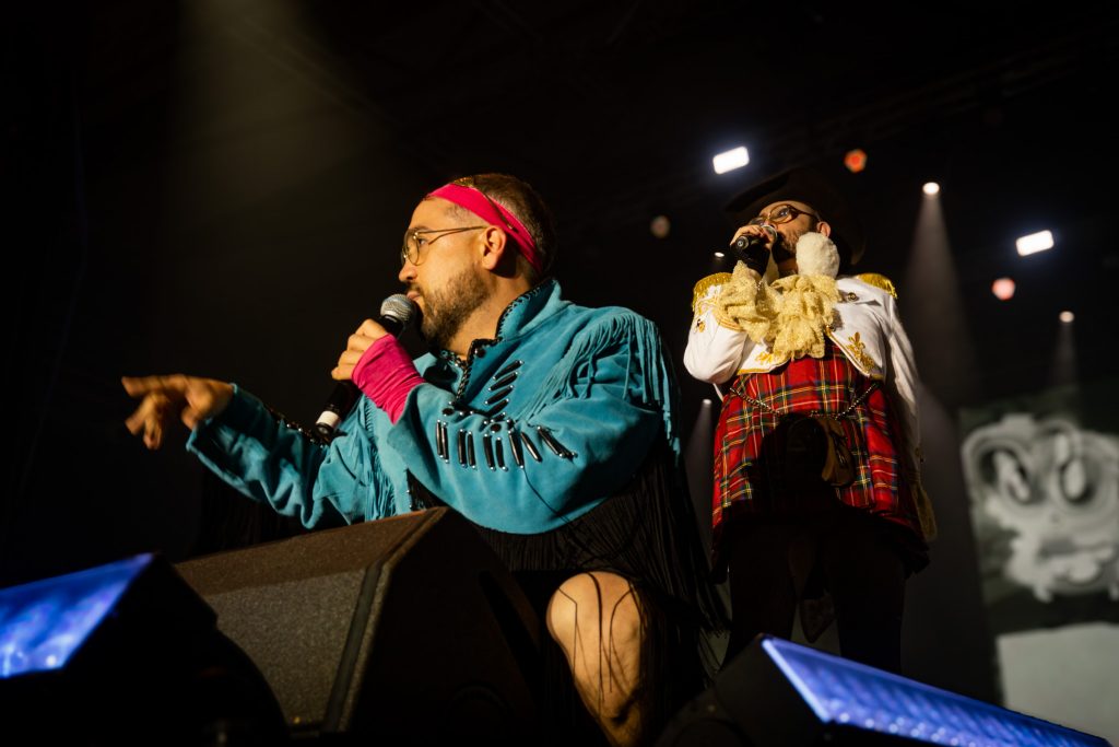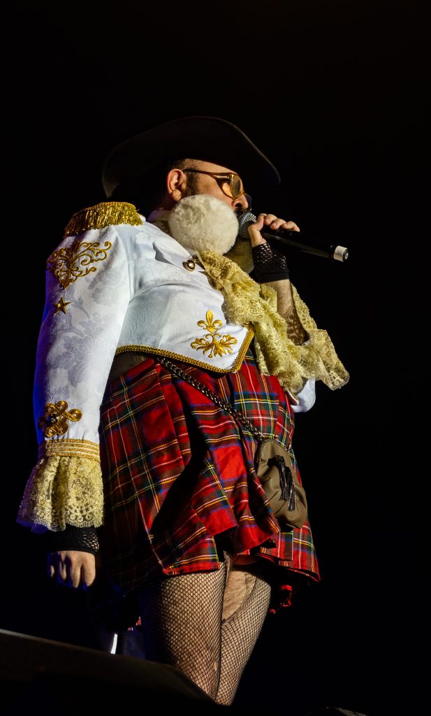 Carlos Areces y Aníbal Gómez aparecieron en escena con la actitud que ya es marca propia: orquesta de pueblo + cabaret + maestro de ceremonias cansado del mundo. Vestuario inicial brillante, exceso pensado. El tono se fijó ahí: esto no es un concierto estándar de pop electrónico, es una gala loca donde el playback está normalizado como recurso dramático, no como fraude.